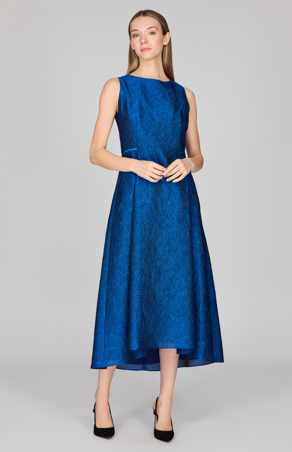 A classic fit & flare silhouette cut in a luxuriously textured jacquard. This dress has deep pleats at the front, allowing the skirt to hang slightly narrower, and an elegant high-low hemline. This dress has side pockets, is fully lined, and zips at the center back.