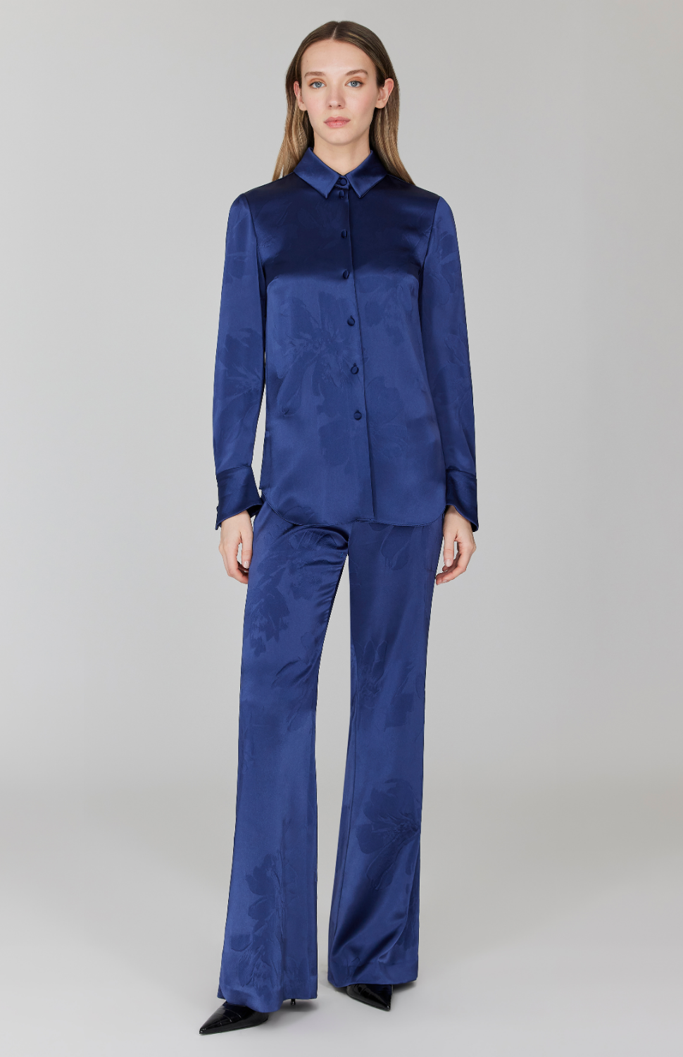 Embossed Floral Satin Flare Pant w/ Back Zip