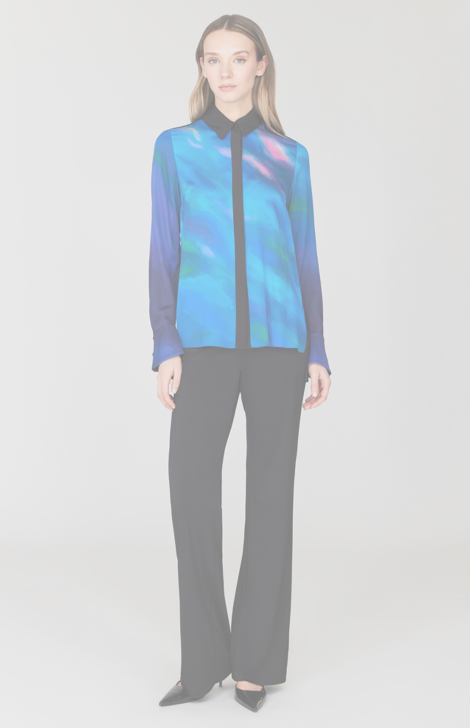 Our classic collared button down blouse cut in the Mountainscape print. This stretch silk shirt is trimmed with black silk and features our signature side banding that create beautifully flattering lines. The effortlessly relaxed sleeves can be styled with the wide cuffs worn down or folded up.