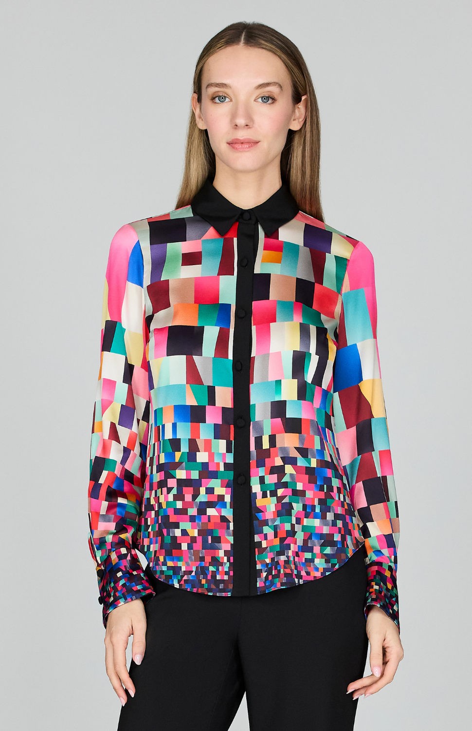 Bojagi Print Silk Fitted Collared Shirt w/ Relaxed Sleeve