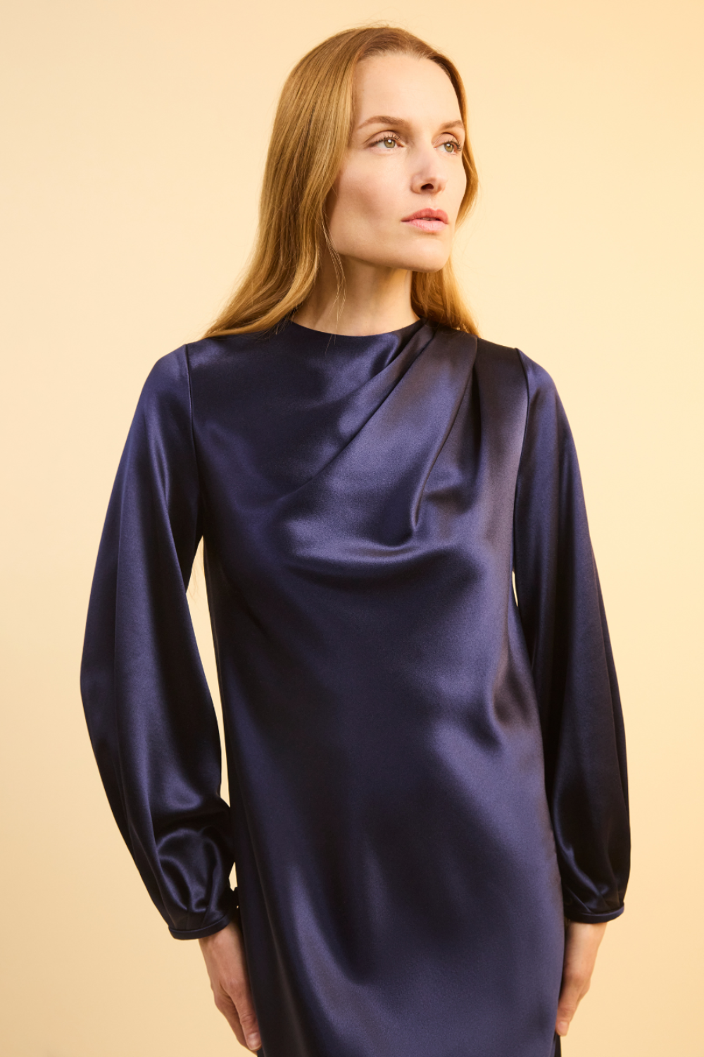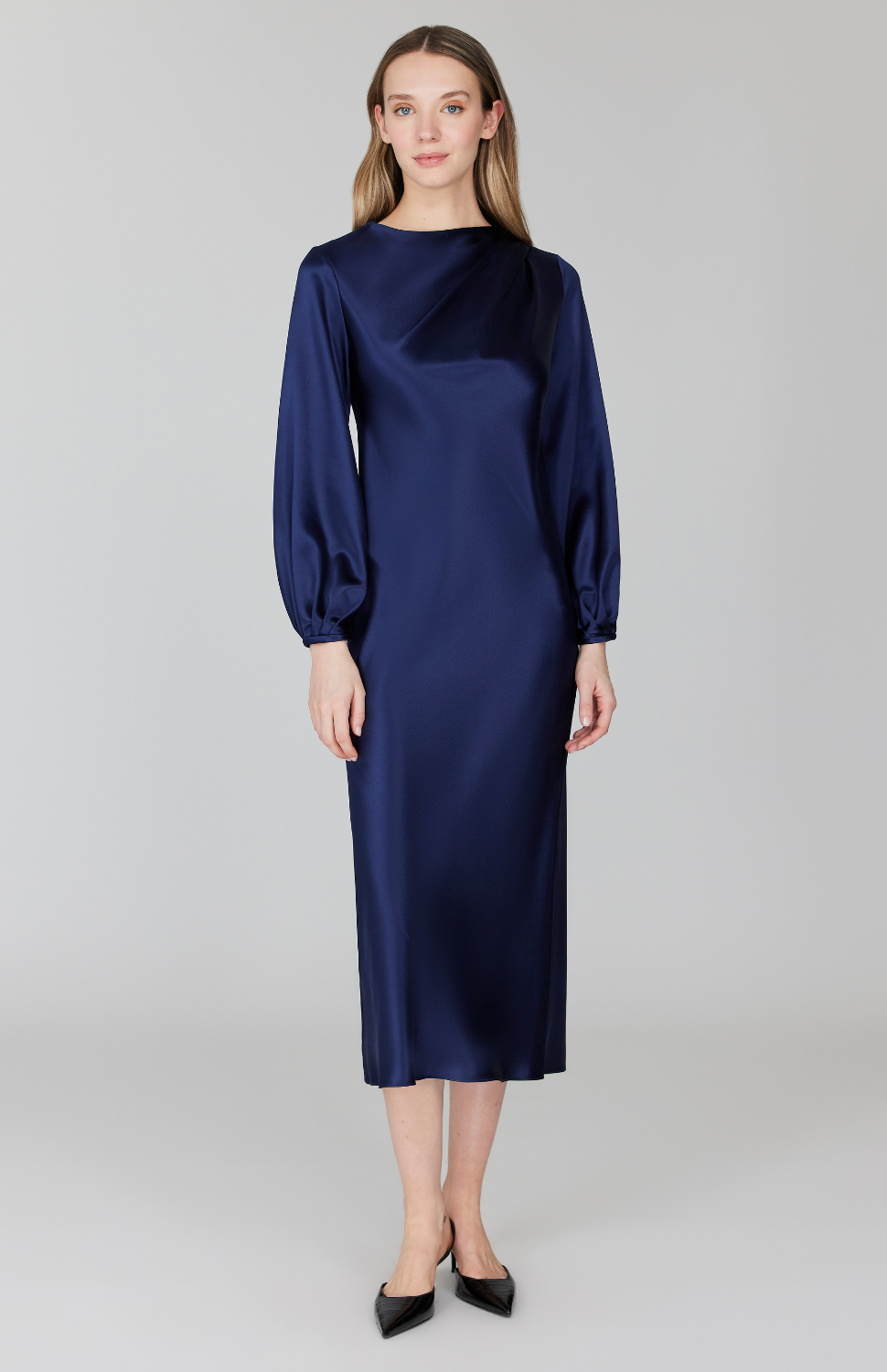 Satin Long Sleeve Bias Dress w/ Asymmetric Pleating